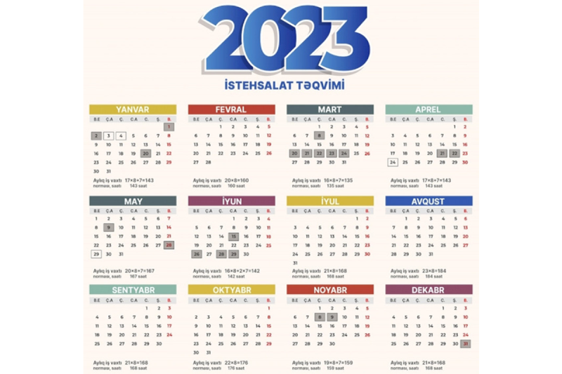 Əmək və Əhalinin Sosial Müdafiəsi Nazirliyinin Kollegiyasının 15 dekabr 2022-ci il tarixli Qərarı ilə 2023-cü il üçün iş vaxtı norması və istehsalat təqvimi təsdiq edilib.