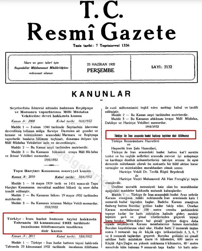 Dos.Dr. Ahmet Özgirayın 1995-ci ildə Atatürk Araşdırma Mərkəzi Jurnalında dərc olunan məqaləsində və Prof. Dr. Nihat Erimin 1952-ci ildə yazdığı məqalədə İranın 1932-ci ildə aparılan danışıqlar nəticəsində razılaşmanı qəbul etdiyi və Kiçik Ararat bölgəsini Türkiyəyə verməyə razı olduğu yazılır. Müqaviləyə əsasən, sərhəd Araz çayının Karasu çayının qovuşduğu yerdən başlayır, Boralan gölünə qədər Karasu çayının talveqini (çayın yatağının ən dərin nöqtələrini birləşdirən xətt) izləyir, daha sonra Kiçik Ağrı dağını, Tendürek Dağı, Kazım Paşa, Başkala. , Türkiyənin Şemdinan və Gelinin dağlarından ayrılması təşkil edildi.