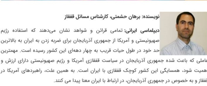 “İran diplomatiyası” saytında dərc olunan məqalədə Qafqaz məsələləri üzrə ekspert kimi təqdim edilən anti-Azərbaycan mövqeli Borhan Heşməti Azərbaycan əleyhinə bir sıra əsassız və qərəzli iddialar səsləndirib.