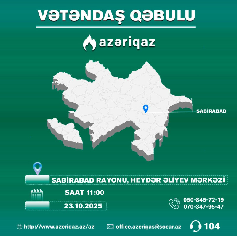 SOCAR-ın “Azəriqaz” İB-nin baş direktorunun Sabirabad rayonunda vətəndaş qəbulu 23 oktyabr saat 11:00-da Heydər Əliyev Mərkəzində baş tutacaq. Görüş zamanı Sabirabad, Saatlı və İmişli rayonlarından olan sakinlərin müraciətləri dinləniləcək.