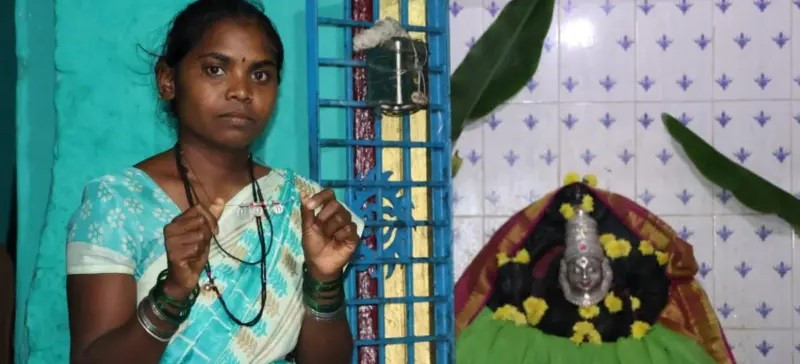Şəklin alt yazısı,Deva-dasi kimi "təqdis olunduqdan" dörd il sonra Çandrika seks işçisinə çevrildi — indi isə o, uşaqlarına zərər gəlməsin deyə anonim qalmaq istəyir.