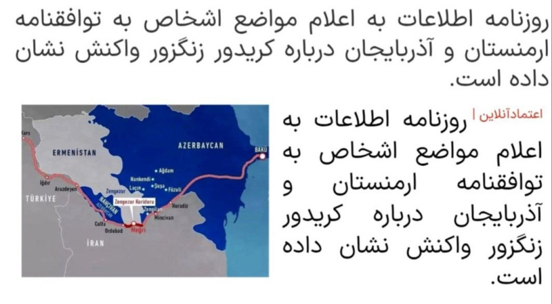 “Etelaat” qəzeti Ermənistan və Azərbaycan arasında Zəngəzur dəhlizi ilə bağlı razılaşmaya dair İranda ayrı-ayrı şəxslərin açıqlama verməsinə etiraz edib. Qəzet yazır ki, "İranın xarici siyasət məsələləri üzrə rəsmi söz sahibi var, o da Xarici İşlər Nazirliyidir. İran İslam Respublikasının xarici siyasəti ilə bağlı ayrı-ayrı şəxslərin, təşkilatların, qurumların, xəbər agentliklərinin mövqeləri ölkənin rəsmi mövqeyi sayılmır.
