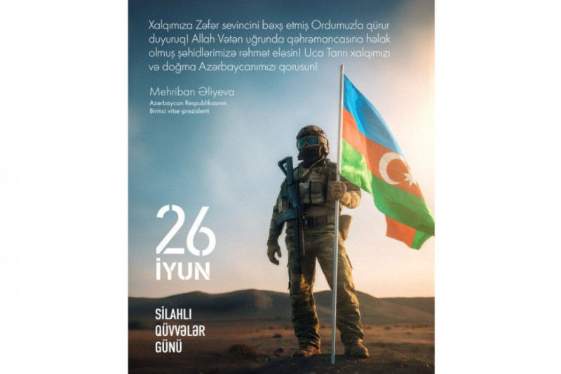 Первый вице-президент Азербайджанской Республики Мехрибан Алиева поделилась на своей официальной странице в Instagram публикацией по случаю 26 июня - Дня Вооруженных сил.